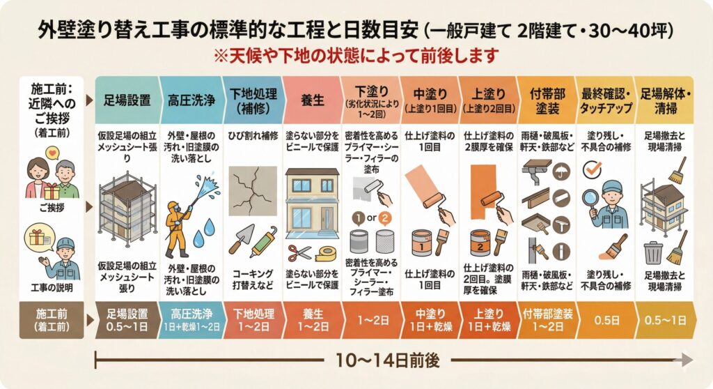 「塗装工事って何日かかるの?」「毎日何をやっているの?」