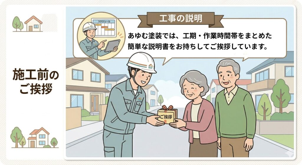 あゆむ塗装では、工期・作業時間帯をまとめた簡単な説明書をお持ちしてご挨拶しています。