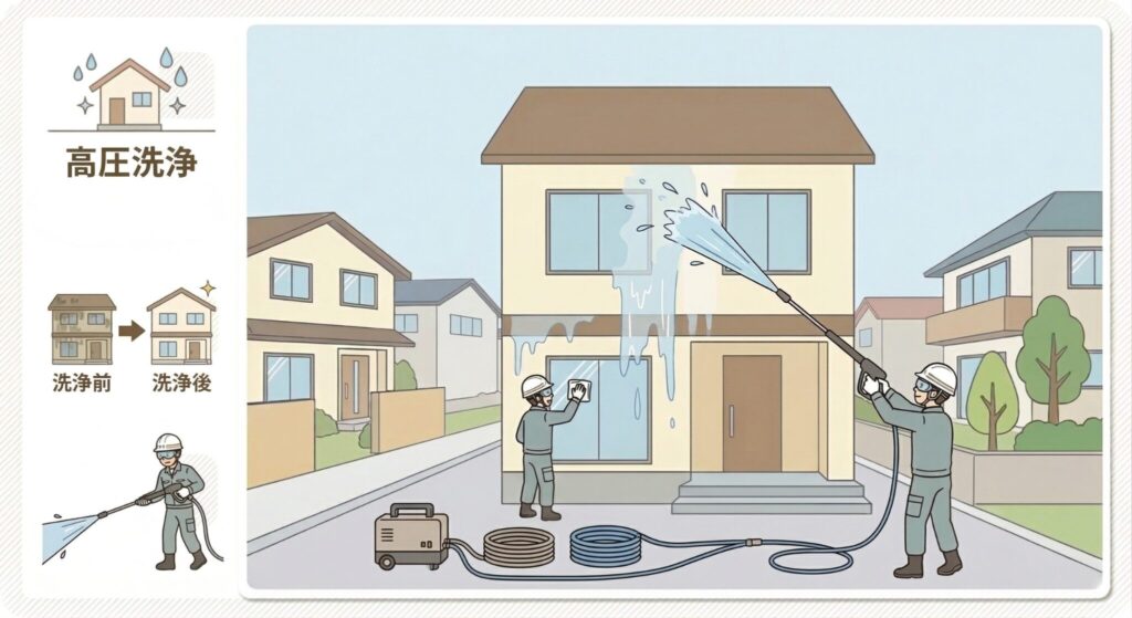 | 高圧洗浄 | 1日+乾燥1〜2日 | 外壁・屋根の汚れ・旧塗膜の洗い落とし |