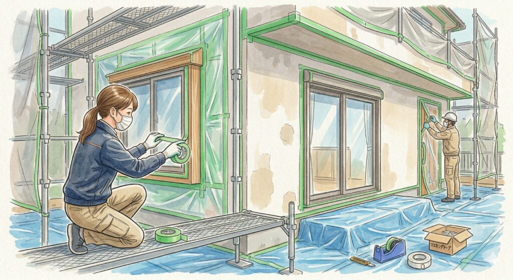 ビニールシートやマスキングテープで保護します。