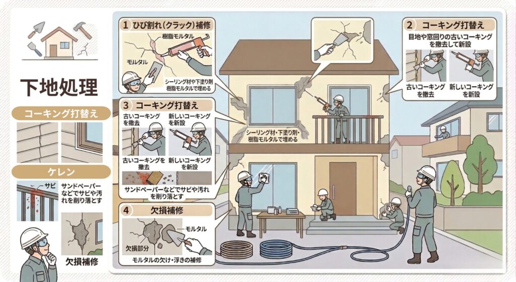 | 下地処理(補修) | 1〜2日 | ひび割れ補修・コーキング打替えなど |