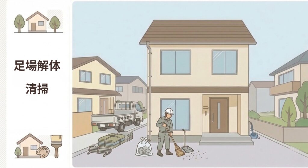 | 足場解体・清掃 | 0.5〜1日 | 足場撤去と現場清掃 |