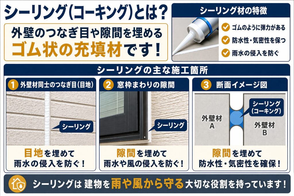 シーリングとは、外壁材と外壁材のつなぎ目(目地)や、