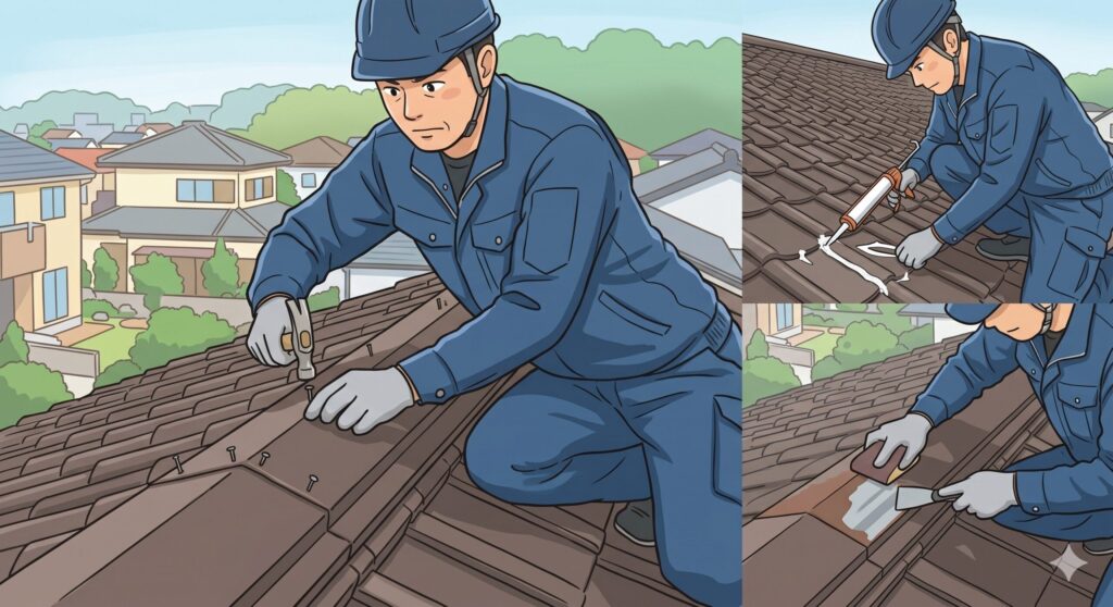 • ひび割れのコーキング補修:屋根材のクラックにコーキング材を充填します。