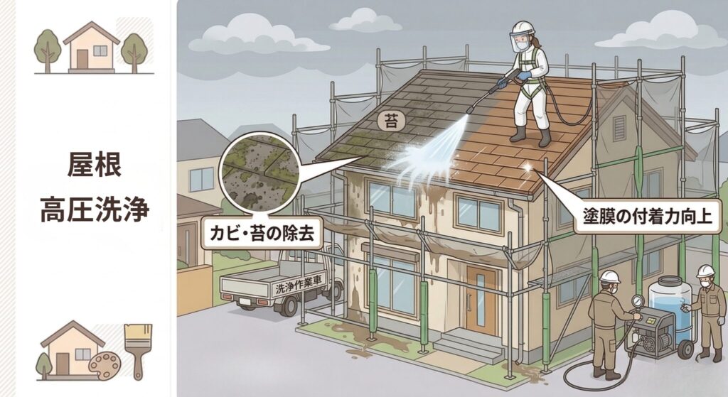 屋根に付着したコケ・カビ・旧塗膜の粉化(チョーキング)などを高圧洗浄機で洗い落とします。